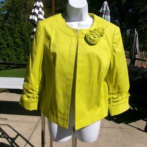 NWOT ANTHRACITE CHARTRUSSE JACKET 14. JACKET IS COTTON,POLYESTER AND SPANDEX. HOOKS AT THE NECK, ROSES ON SIDE AND 3/4 RUCHED SLEEVES. BUST 38" LENGTH 23" SLEEVE LENGTH 18".