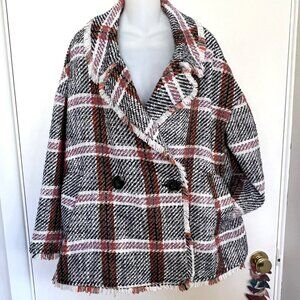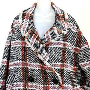 New without tags Anthropologie Eva Franko “Carrie” Jacket Size Medium Beautiful double breasted plaid jacket featuring button front, drop sleeve, tab pockets, frayed fringe trim, oversized styling and fully lined. Made of hand washable polyester and spandex. Measurements: Bust: 48” Length: 28”. center back tag to hem including frayed trim.
