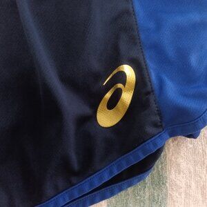Made in Japan NWOT ASICS running short, Navy with Blue sides. This is a size "XL" short. Estimated to Fit 33"-35" waist. The shorts feature an internal drawstring closure, front ASICS New Logo in gold, and full (front and back) internal lining, Great short for running, beach activities, or the gym.