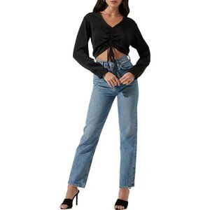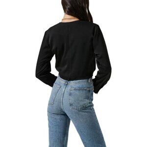 NWOT ASTR The Label Satin Ruched Long Sleeve Cropped V-Neck Blouse Black Size X