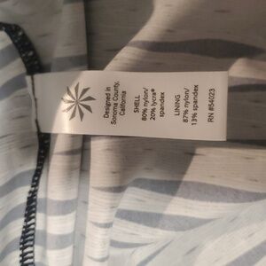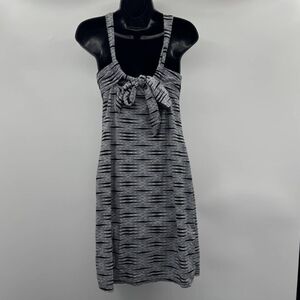ATHLETA KIKI SWIM DRESS. COLOR BLACK/WHITE/GREY. STRIPED HALTER STYLE SPORTS DRESS WITH ADJUSTABLE STRAPS AND BUILT IN BRA