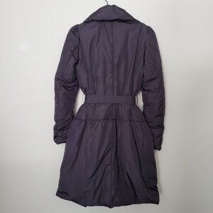 A brand-new, feminine, double-breasted down coat with a flattering puff shoulder and a waist belt for a defined silhouette.