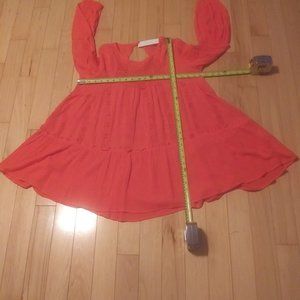 I used crayola crayons to try and match the color. The crayola crayon color that best resembles the color of the blouse is Red Orange see last pic,. Romantic, peasant, gypsy . Semi sheer see next to last pic . Key hole back. hand wash