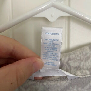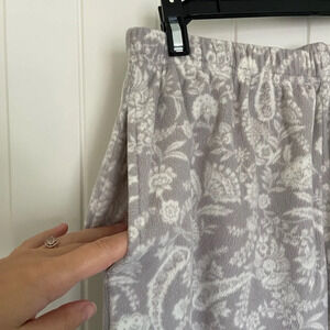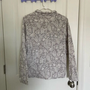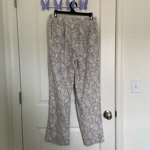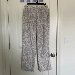 Women’s Adonna Sleepwear matching pajama set. Set includes a long sleeve top & bottoms. Colored light gray & cream with a floral-like pattern. Top has full front button & pants have pockets & an elastic waistband. Fleece material—so incredibly soft!! Size medium. Smoke free home!