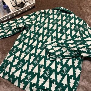 Cozy pajama top with a festive tree pattern. Button-up front. Perfect for lounging.