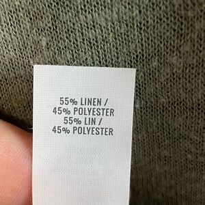 Front pocket. Short sleeves. Distressed lived in look. Linen/Poly. Pit to pit: 24”, length: 24”