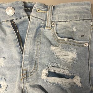 New without tags (but one size sticker?? Ok!) high rise curvy stretch midi distressed denim shorts by Aéropostale, size 00. Super light wash. Cuffed. Five pocket style. Zip fly and button closure.