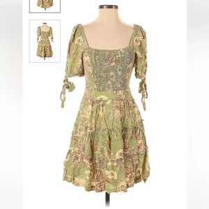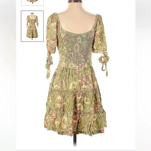 NWOT Aguabendita Floral Dress Women’s Sz MED 100% Rayon Green/Beige Tie Sleeves. Measurement from shoulder to hem 37.5”. Armpit to armpit laying flat 17”. Side pockets! Stretchy bodice. Gorgeous!