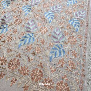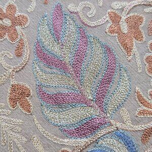 Beautiful chain-stitch embroidered boiled wool scarf from esteemed Indian scarfmaker Ahujasons. Flawless condition. The last picture is not a flaw--it's the hem and there's a line of open weaving there. The leaves have a shimmering detail to them with gold thread--I tried to capture it in the video.