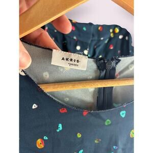 This striking Akris Punto set features a sleeveless asymmetric peplum top and tailored pants, both adorned in the signature multicolor “Boulder” print on a deep navy background. The flattering silhouette is equal parts playful and refined, making it perfect for upscale daytime events, artful evenings, or a standout professional look.