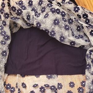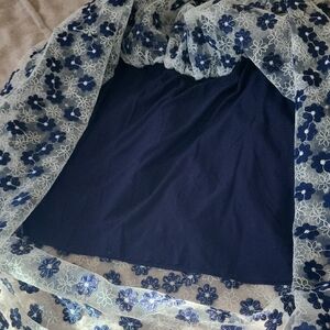 see through lace,except small navy blue skirt underneath,knee length. Perfect for any occasion, it adds a touch of grace to your ensemble.