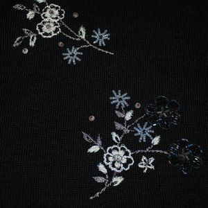 New, never worn, so pretty with embroidered flower design in silver and light blue threads with pearls and small bronze sequins, acrylic, 20 inches pit to pit making it a 40 inch bust.