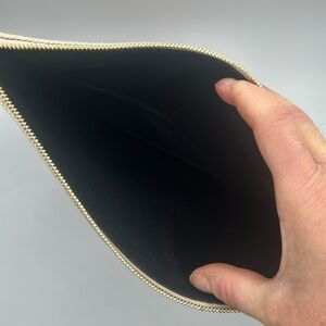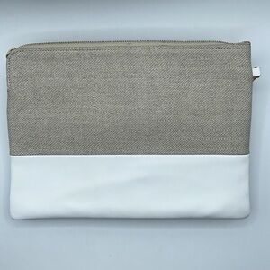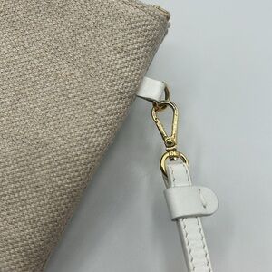 Understated elegance meets coastal chic! Crafted in Italy, this gorgeous white & burlap taupe canvas clutch captures that effortless coastalcore vibe. Features a detachable wrist strap for versatility. Timeless luxury with no signs of wear.