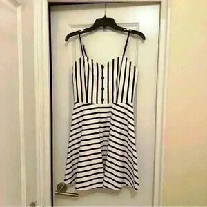 The dress features a timeless black and white striped pattern, with a sleeveless design and a short length for a chic and sophisticated look.