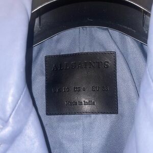 NWOT Beautiful slate blue leather moto jacket. Got it as a gift, never wore it once. Just been sitting in my closet. But it truly is a luxurious, well made jacket. It feels heavy, and the zippers are thick. Genuine leather. Excellent condition.