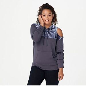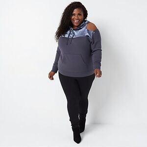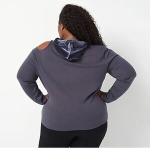 Mix it up with some mixed media and cut-out details. This hoodie has a bold cutout detail on one shoulder, along with French terry and stretch velour knit fabric. From All Worthy Hunter McGrady.