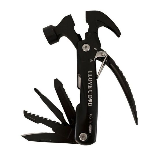 The Amazon Men's "I Love U Dad" print unique all-in-one mini multitool is crafted from durable stainless steel and comes in a sleek black finish. This versatile tool includes a plier, hammer, wire cutter, knife, screwdriver, saw, blade, bottle opener, and nail file. It also features a protective nylon case for easy carrying and storage. Perfect for a handy gift, this multitool combines functionality and sentimentality in one compact design. Great Father’s Day Gift