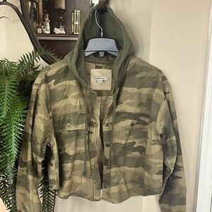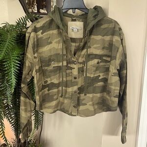 NWOT American Eagle Camouflage Cropped Button Up Hoodie Jacket Olive Drab Green Shacket.  Women’s size Medium.