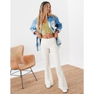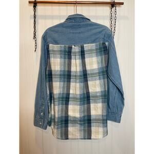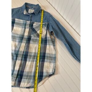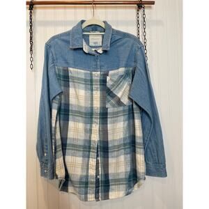 NWOT American Eagle Mix Denim Plaid Contrast Button Shirt Blue & Cream Size S