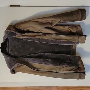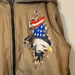 NWOT Brownish-Green Sherpa lined Jacket with Eagle coming through the American Flag. Zipper works great! Never been worn. So rips, tears or stains. Smoke and Pet free home.