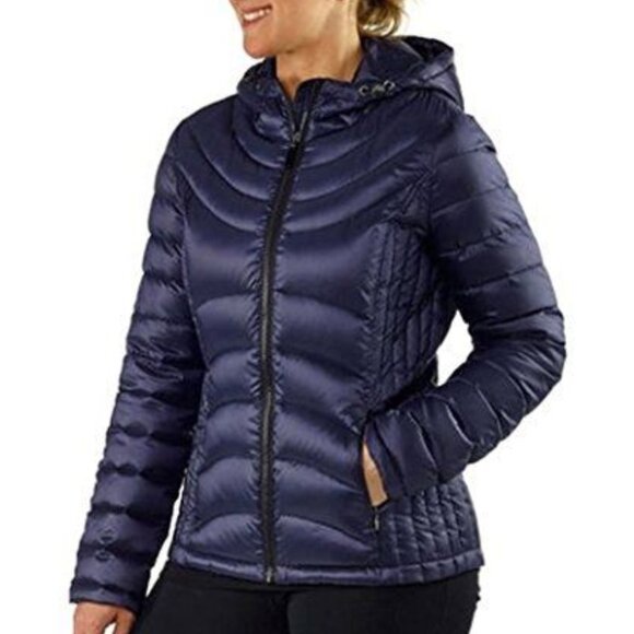 New without tags Andrew Marc Packable Lightweight Down Jacket in size S, no flaws. The color is a cool-toned dark blue; black and pewter gray hardware. 2 pockets + 2 inner pockets. Fully lined; duck and waterfowl down; adjustable hood with drawstring.