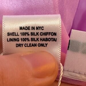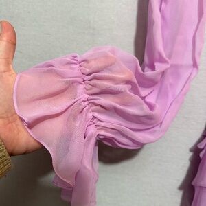NWOT Angelance 100% Silk Chiffon Mini Dress with gift box in purple. Incredibly lightweight and perfect for a warm summer night. Lined, but still semi-sheer. Long, sheer sleeves with elastic at the cuffs. V-neck. Tie-up back at top with zipper bottom. Side cutouts. Size large.