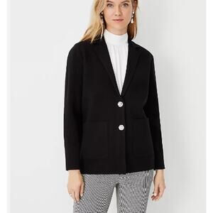 Elevate your wardrobe with this stunning sweater blazer from Ann Taylor! ✨ The jeweled buttons add a touch of elegance, transforming this tailored piece into a true gem. The notched lapel and long, button-open sleeves offer versatile styling options. Featuring a two-button front and convenient front pockets, this blazer is both chic and functional. Perfect for layering and adding a polished look to any outfit. Don't miss out on this must-have addition to your closet!