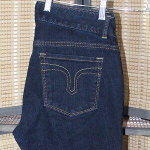 Ann Taylor LOFT Petite Curvy Bootcut dark wash jeans with decorative pocket embroidery.