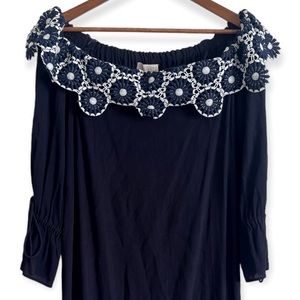 NWOT Ann Taylor Loft Off the Shoulder Embroidered Shift Dress Size Large. Navy with navy and white floral embroidery along the neckline, shift style, tie bell sleeves, 100% Rayon. Great condition, never worn.