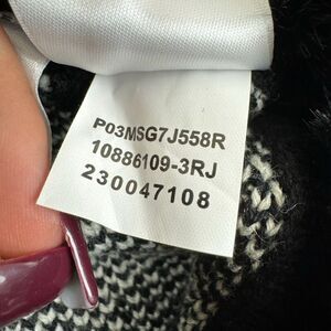 This Anne Klein black striped poncho sweater is perfect for any occasion. Featuring a relaxed fit, full zip front, and a detachable faux fur collar, this sweater is sure to keep you cozy and stylish in the fall, winter, and spring. The cable-knit pattern and fur trim accent add a touch of elegance to this versatile piece.