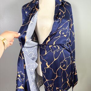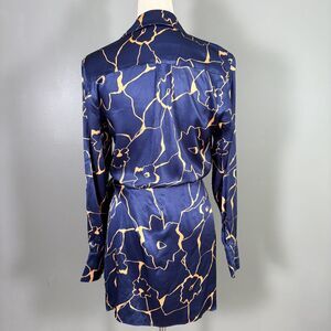 An adjustable tie secures this long-sleeve shirtdress in a wrap silhouette decorated by abstract blooms and framed by long sleeves.