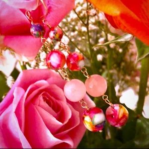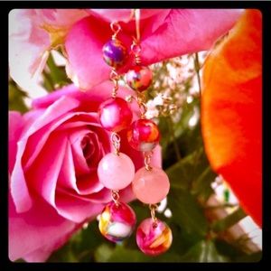 Exquisite Anthropologie tropical pink earrings made with painted mother of pearl & rose quartz gemstone beads, a little like wearing blossoming roses around your face๐ทThe painted beads have variations in color & pattern depending on how theyโre turned. Their beautiful warmth of light & color makes them especially flattering next to the skin. Perfect for everyday & also dressy enough to add a dash of radiant pink for special occasions. Incl. gold hooks, approx. 3โ long, 3/8โ wide. NWOT ๐ท๐