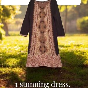 Discover elegance with this beautifully designed black, brown and terracotta dress with beaded accents. Perfect for any occasion, its intricate patterns add a touch of sophistication.
