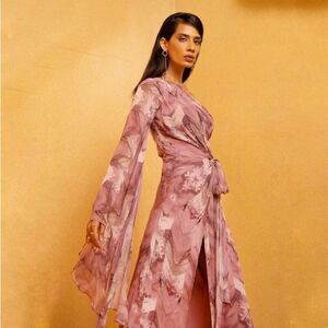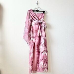 Lilac one-shoulder draped gown with floss print, single long-sleeve, high slit & tie-up front.