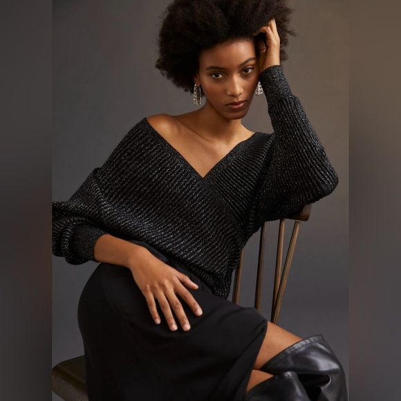 Give your little black dress the night off with this party-ready pullover that features a shimmery finish and surplice silhouette that's just as cozy as it is chic.