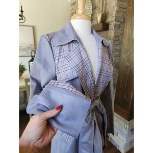 Keywords: trench coat, plaid coat, gray jacket, belted trench coat, long sleeve jacket, women's outerwear, lightweight trench, casual jacket, fashion coat, stylish jacket, spring coat, fall coat, plaid trench coat, women's coat