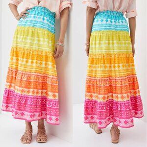 Brand new without tags Anthropologie x Geisha Designs Rainbow Tiered Maxi Skirt, size XS Petite. Stunning piece! Fits my 28" waist, but a little too snug around the bum for me, so never worn. Multicolored A-line tiered silhouette with an elastic waist, maxi length. Gorgeous pattern with very bright colors, sure to be a summer favorite for its lightweight, boho and breezy qualities.