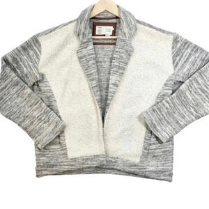 Anthropologie x Saturday Sunday Moelleux Jacket Collared sweatshirt open draped front jacket featuring cream sherpa detail on the bodice. Grey and white space-dyed body with faux leather lining on interior.