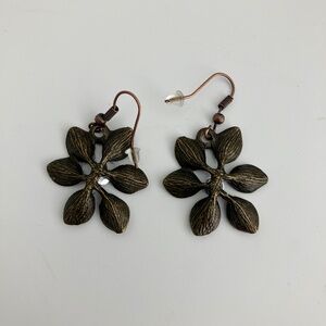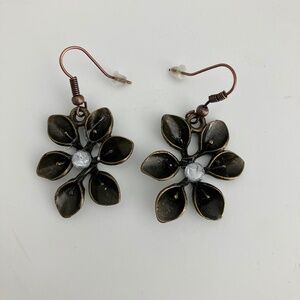 NWOT Antiqued brass / bronze tone and floral earrings with a white crystal in the center. The flower measures 1", and the total length with the white is about 1.5".