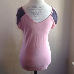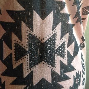Stretchy knit top with grey Aztec design and rhinestone embellishment in the center. Sleeves have grey chiffon panels.
