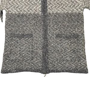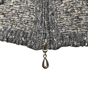 DESCRIPTION: Brand new (without tags) short sleeve full zip cardigan features a marled knit colorway made from shades of gray yarn and front zipper closure with decorative charm zipper pulls including a Celtic trinity knot at the collar.
