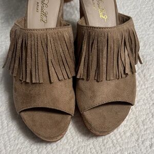 Chic suede mules with fringe detail. Comfortable cork wedge. Ideal for everyday style.