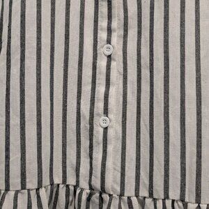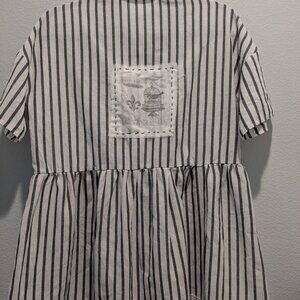 It is now a lovely tunic top with gray and white stripes, a drop waist and button up with short sleeves. It measures 29 inches in length, waist 19 inches flat and armpit to armpit 21 inches flat.