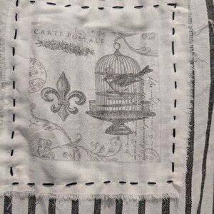 Okay, the story: I purchased a tunic online...when it arrived it was nothing like the picture. They don't take returns, so I modified what I didn't like. I shortened the length and shorted the sleeves. I added a lace at the hemline and a shabby chic hand stitched muslin picture to the back. This has never been worn as it was also too small for me but I thought I could make it into something that someone else might like to wear.