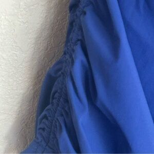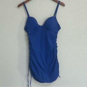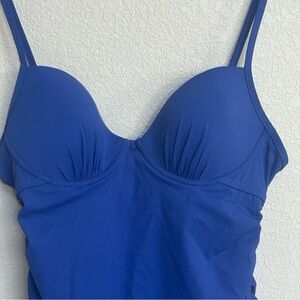 Supportive one-piece swimsuit from Assets by Sara Blakely Spanx. Features molded cups with underwire, adjustable straps, full coverage, tummy-smoothing ruched sides, and moderate leg openings. Lining is attached. Rich cobalt blue color. Style #1714. Size Medium.