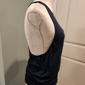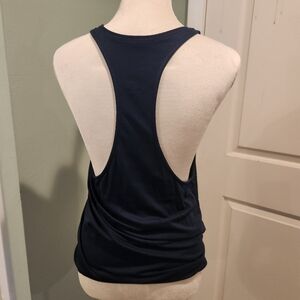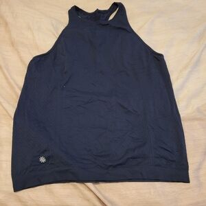 Navy blue Athleta deep arm muscle tank. Well ventilated and loose fitting. The underarm opening is about 11 inches long. The top of the neck to the hem is 24 inches. New, never worn.