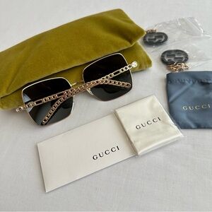 Authentic. Gucci Aviator women’s sunglasses. Model: GG0724S. Square frame/temple. Approximately: Lens 61mm, bridge size 18mm, temple length 135mm. Brand New, never used.