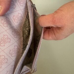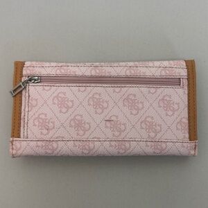 Authentic GUESS INC. trifold wallet with logo print. On the back is a small mark that is a manufacturing error. Brand new, never used!