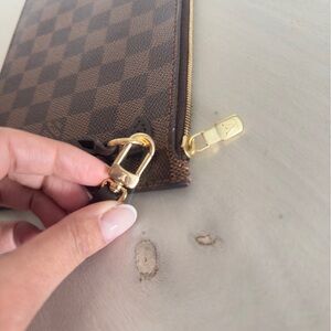 NWOT Authentic Louis Vuitton Damier Azur Neverfull Pouch Wristlet Wallet is brand new and in excellent condition. It was purchased with my Neverfull PM, and has been sitting inside my purse and has never been worn. Since I have never used it, it's looking for a new home! Perfect to wear for errands or a night out when you don't want to carry a big purse.