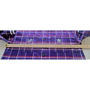 Adidas Korn flannel, men’s overshirt, heavy-duty plaid shirt, Adidas Korn collaboration, streetwear jacket, nu-metal apparel, rare Adidas flannel, Korn band merch, Adidas outerwear M